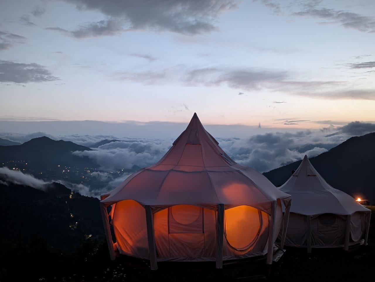Uzčāpoju līdz stilīgajai apmetnei ar baltajām, greznajām teltīm, no kuru lodziņiem pavērās skats uz kalniem. Atrados vismaz kilometru virs jūras līmeņa. Karaliski! Apmetnē varēja dzīvot, nakšņot, ēst un rītos nodarboties ar jogu, tomēr vienatnē nevēlējos te palikt.