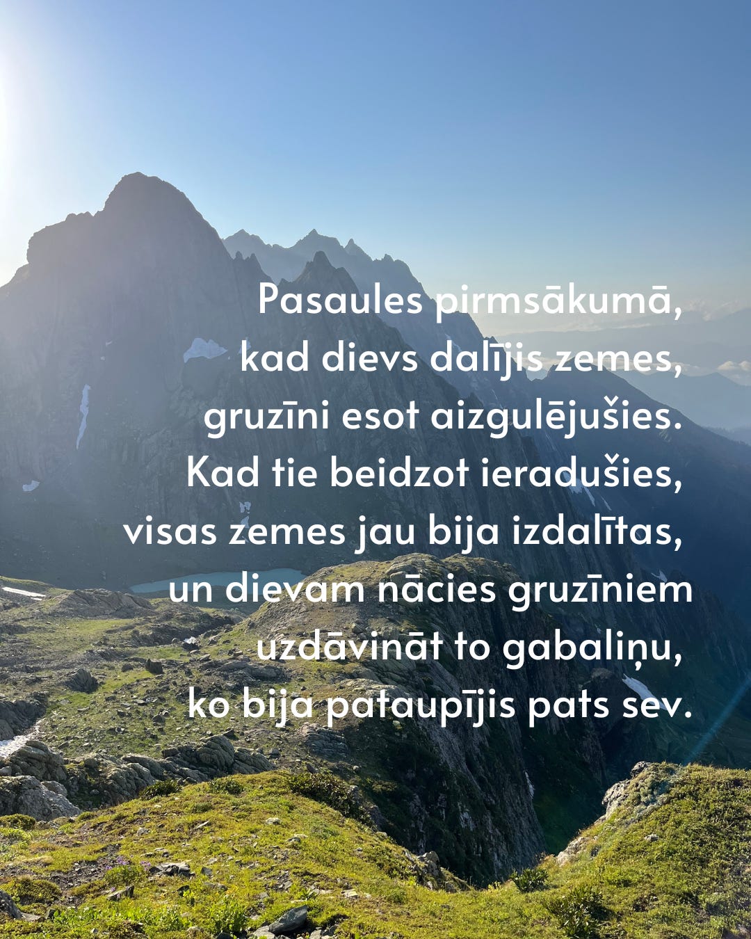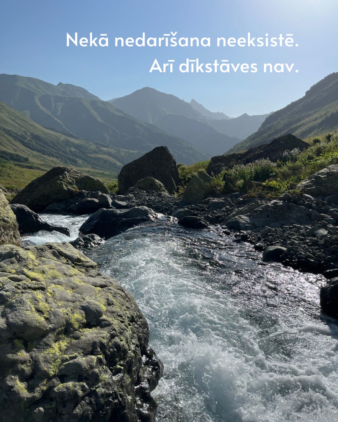 Lielās lietas var būt tik lielas, cik lielām atļauju tām būt. Turklāt lielums ir relatīvs. Vienam vajadzēs pasaules skatuves, otram pietiekami liela būs neuzkrītoša dzīve, un abas ir lielas lietas. Daždien liela lieta ir sašķirot un salikt pa pāriem izmazgātās zeķes, bet citreiz spontāni šķērsot 150 kilometrus pa Mazo Kaukāzu ar kājām. Dzīve ir pārsteigumu un iespēju pilna. Ne vienmēr man pašai tas viss arī jārada. Jāpieredz gan.